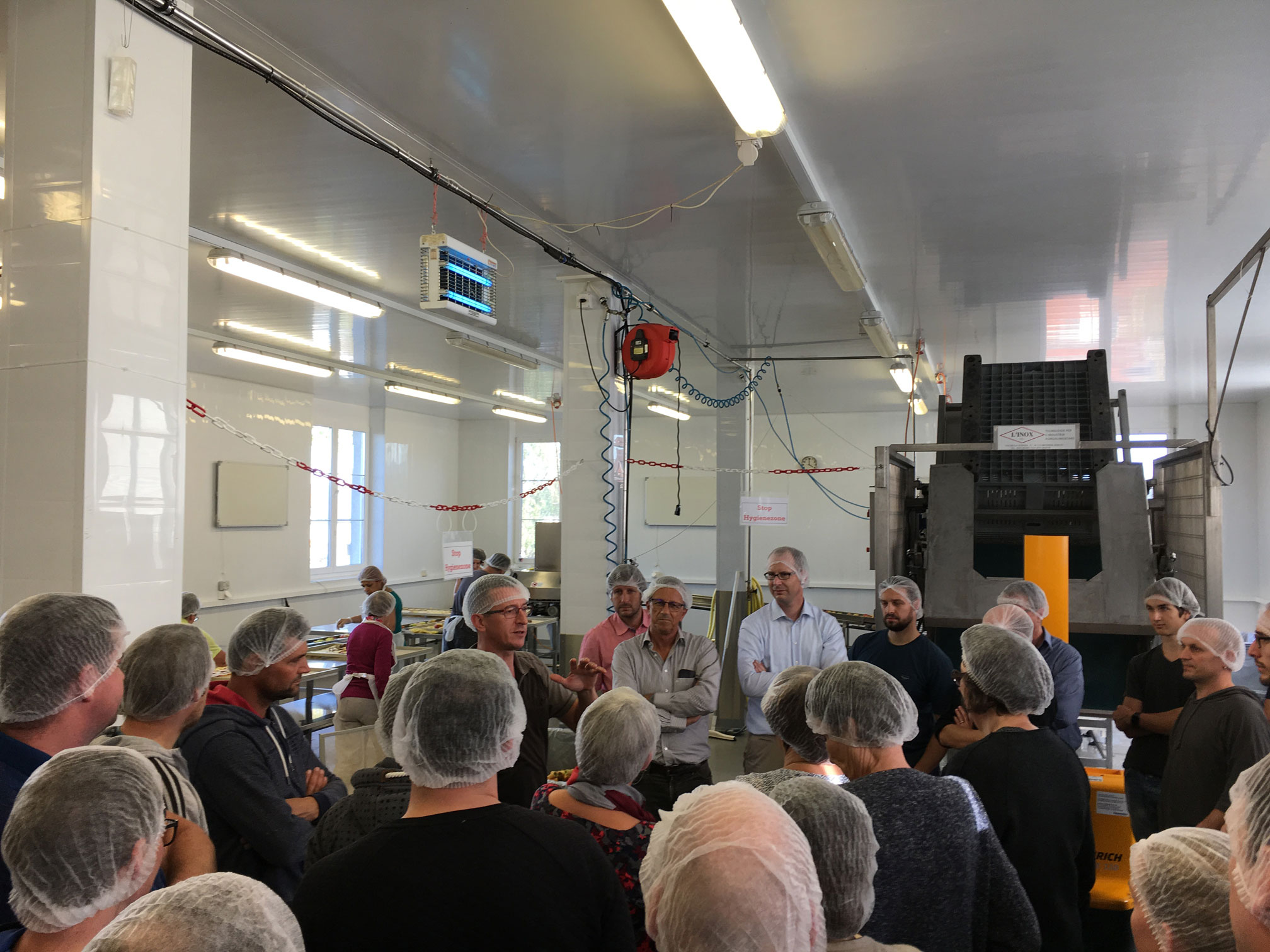 An der Sonne erklärte uns Roland Kauderer den Werdegang des heute erfolgreichen Unternehmens. Interessant war, wie aus einem ursprünglich 14 ha grossen Obstanbaubetrieb mit verrückten Plänen im Kopf und einem Buisnessplan auf Papier auf einmal ein Produzent für Trockenfrüchte wurde. Er erzählte sehr ausführlich von den Planungen der Umsetzung, den nicht Umsetzungen und Änderungen und dass das Ganze auf einmal in eine andere Richtung lief als geplant. Es zeigte einmal mehr auf, dass auch ein landwirtschaftlicher Betrieb flexibel und marktgerecht produzieren muss. Seine Erzählungen waren hochspannend und seine Anekdoten brachten uns oft zum Schmunzeln.