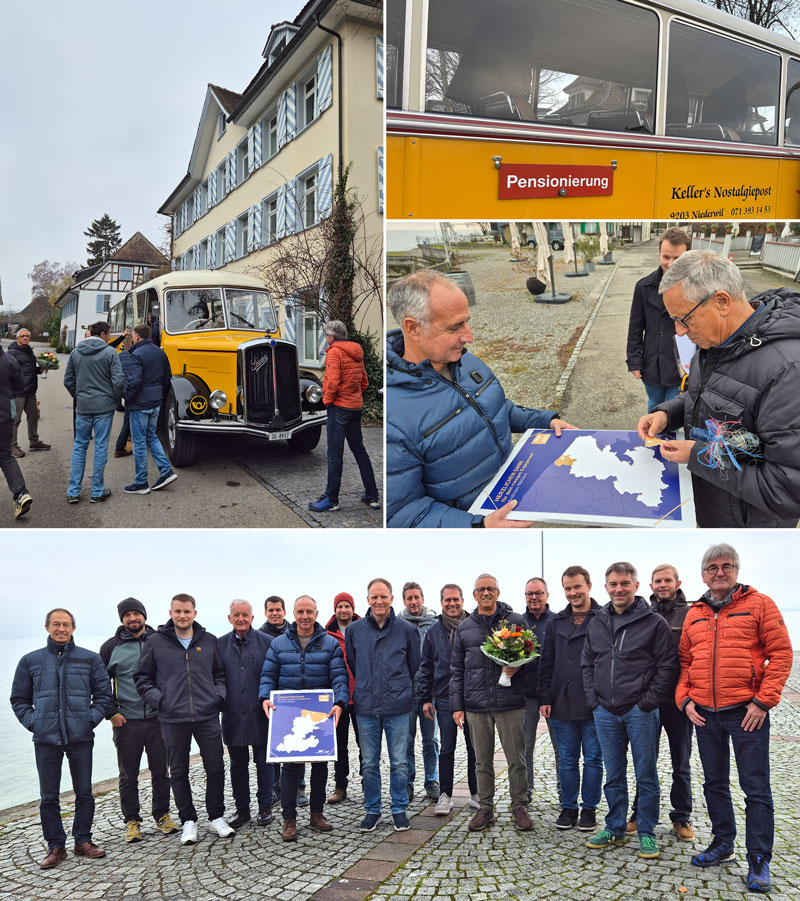 Im Rahmen eines gemeinsamen Ausflugs traf sich die erweiterte Geschäftsleitung, um die langjährige und vertrauensvolle Zusammenarbeit mit Andreas Niklaus zu würdigen, der in den wohlverdienten Ruhestand tritt. Der Ausflug mit einem nostalgischen Postauto in die Nachführungsgemeinden von Andreas bot eine willkommene Gelegenheit, den Arbeitsalltag hinter sich zu lassen und in entspannter Atmosphäre miteinander ins Gespräch zu kommen.